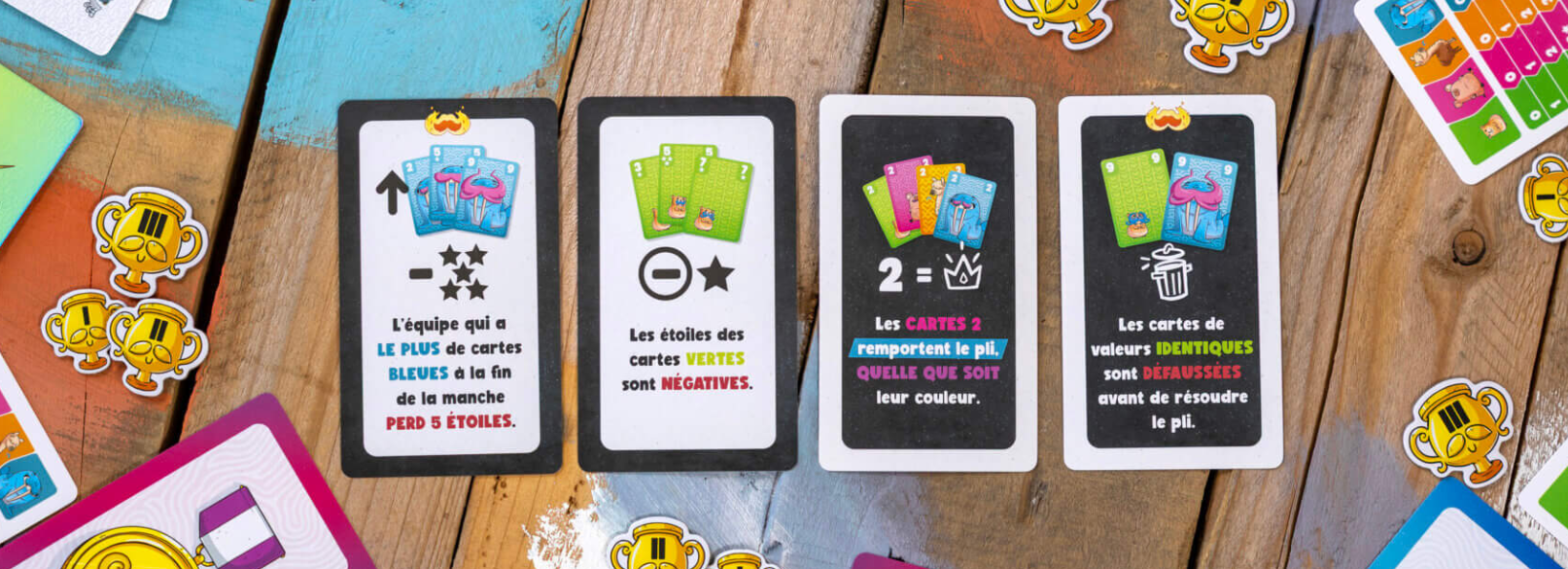 Après chaque manche, on conserve la règle précédente, et on en ajoute une. Vous imaginez bien qu’à partir de la troisième manche, le jeu devient plus complexe sans être totalement chaotique pour autant (on reste sur un jeu de plis).